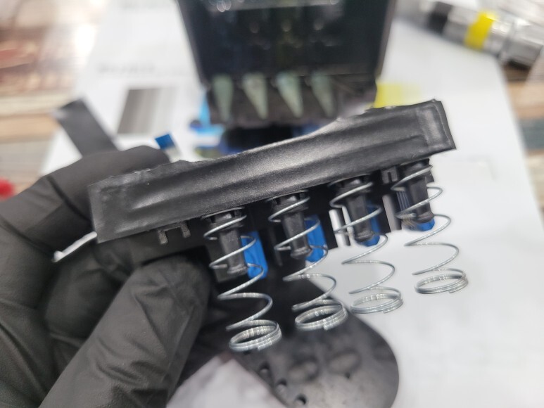 헤드를 분해해니 칩판부 비닐이 탈락되어 있었습니다. 출력불량으로 헤드 청소를 여러번 하면서 헤드 슈팅에어라인 비닐이 탈락된 걸로 예상됩니다.