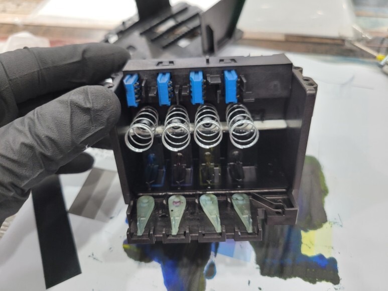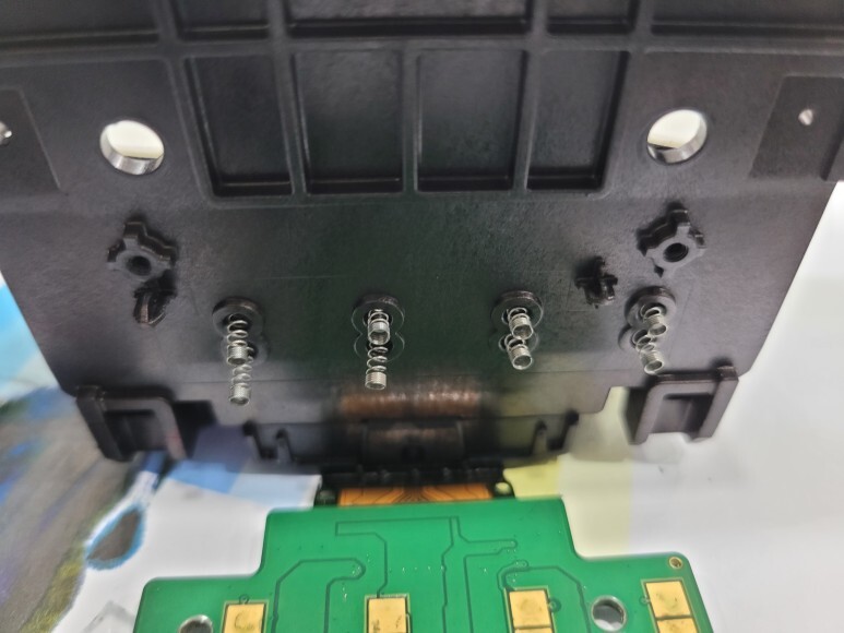 HP 7740 무한잉크 프린터 헤드의 칩판부를 개방하여 크리닝, 스프링을 제거하고 납쇼팅하였습니다.