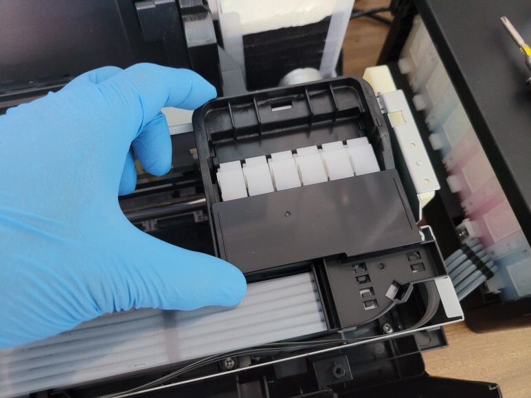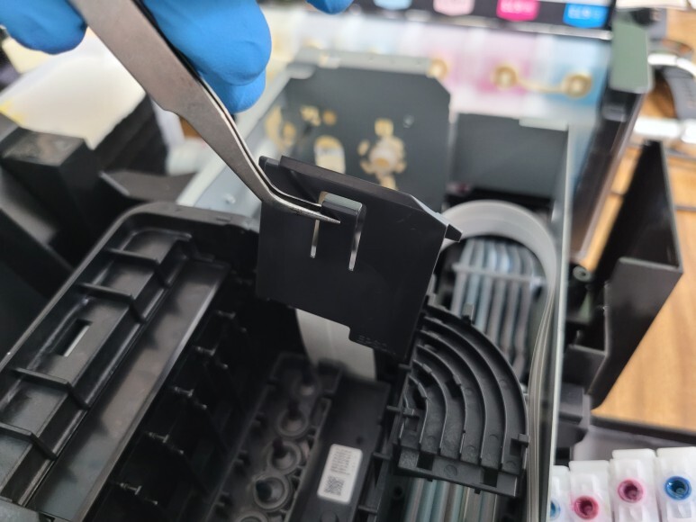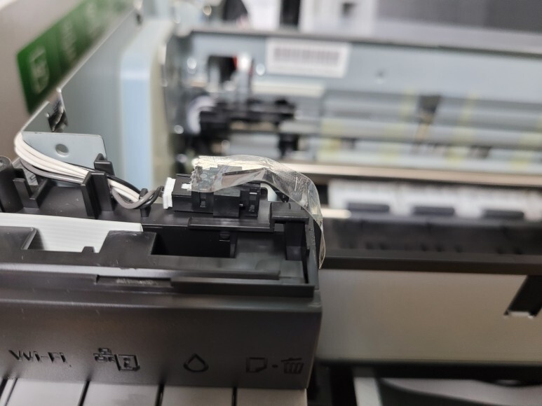 엡손 L805 무한잉크 6색 프린터의 헤드를 빼서 플렉서블 케이블을 제거했습니다.