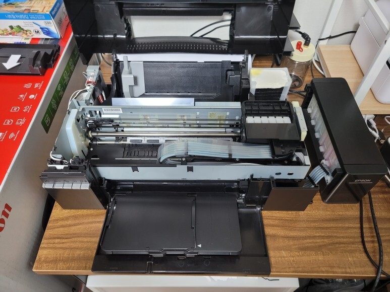엡손 L805 무한잉크 6색 프린터 개방 후에 오른쪽에 호스에 연결된 카트리지가 보입니다.
