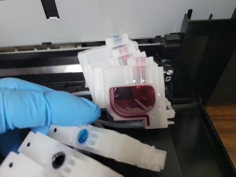 카트리지를 빼니 잉크가 모두 빠져 있어 주사기로 석션하여 6색 카트리지 내부에 잉크를 가득 채웠습니다.