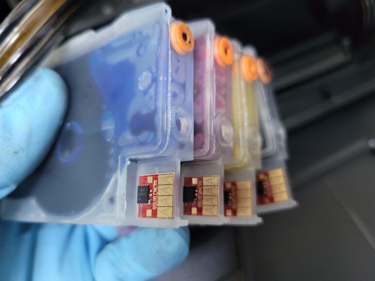 카트리지 잉크 석션하여 호스 및 카트리지 내부에 잉크를 가득 채웠습니다. 유한 4칩 온라인용 장비이지만 굼한지 얼마 안 되고, 현 상태는 문제가 없어서 추후 문제시에 No Chip기업형 전환하기로 했습니다.