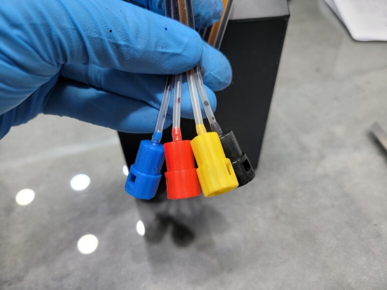 퀵차단밸브를 장착하여 무한잉크공급기와 결합, 연결했습니다. 카트리지 석션하여 호스 및 카트리지 내부에 잉크를 채웠습니다.