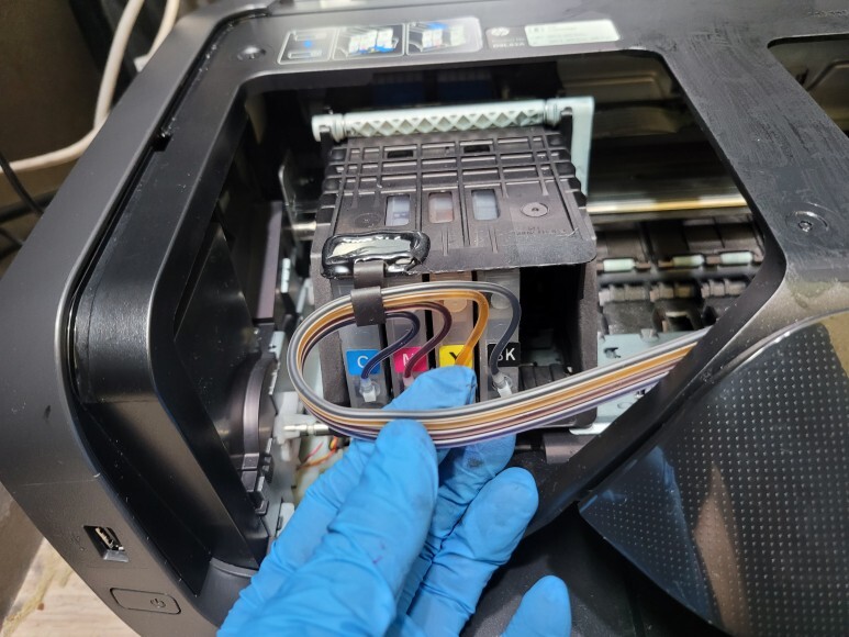 HP 8210 무한잉크 프린터의 하우징 타공하여 호슬르 밖으로 빼고 무한잉크공급기와 퀵차단밸브로 결합했습니다.