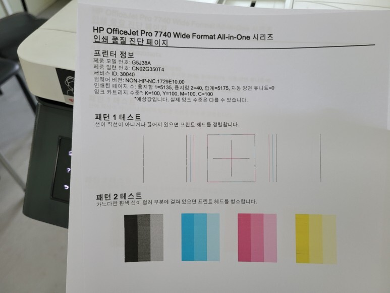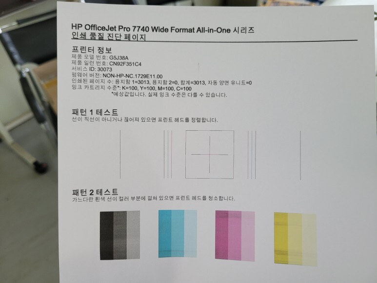 HP 7740 무한잉크 A3 팩스복합기의 인쇄품질진단페이지 확인했습니다.