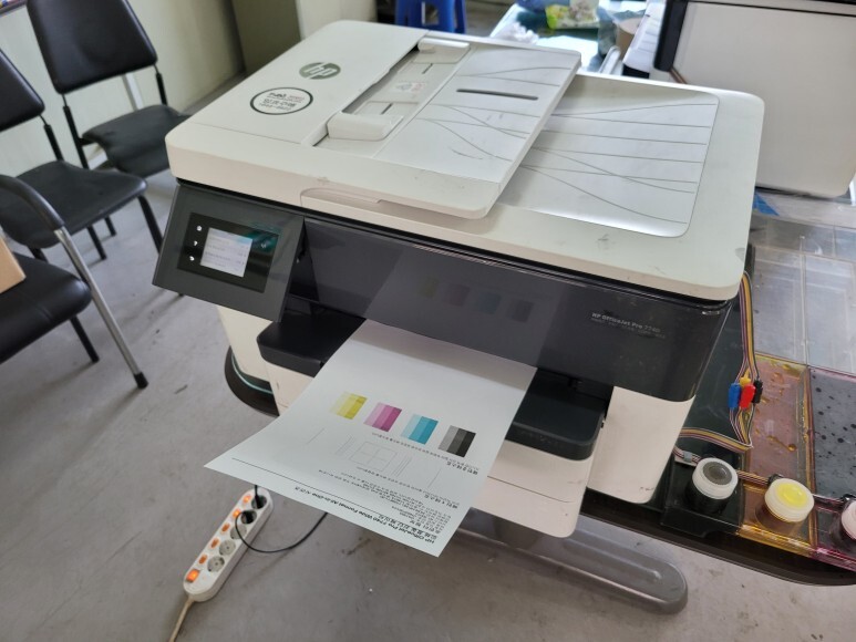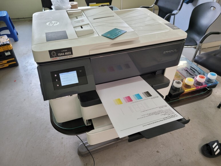 경기도 평택시 안중읍 소재 플랜트 건설현장에 자주 이동하여 사용하는 HP 7740 무한잉크 A3 팩스복합기 * 총 2대인데 출력상태가 불량하고 일부 훼손되어 출장수리 요청, 스케줄 잡아 이동 수리 완료했습니다.