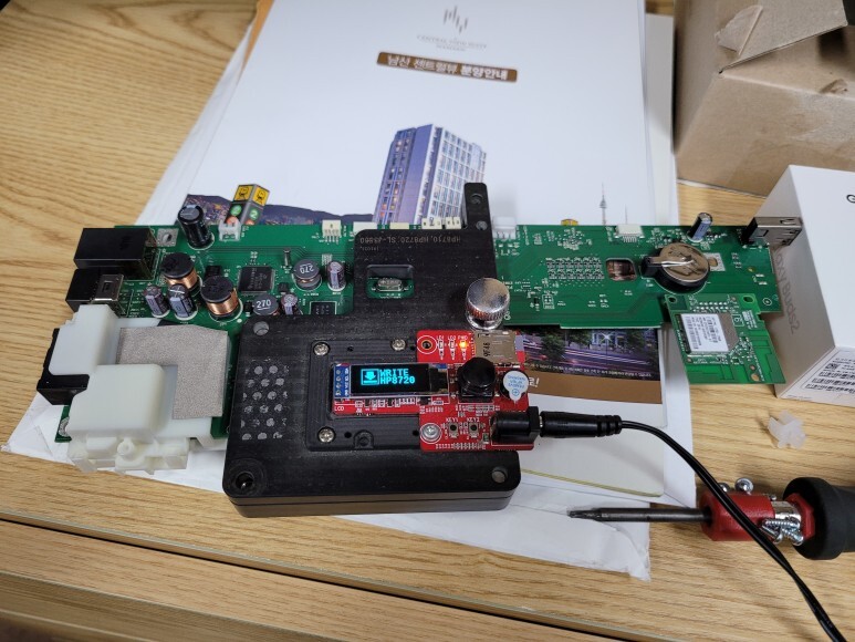 HP 8720 무한잉크 메인보드를 No Chip 펌을 하기 위해 지그에 물리고 전원을 연결했습니다. 메인보드 No Chip 펌 라이팅한 후에 메인보드 재장착 완료했습니다.