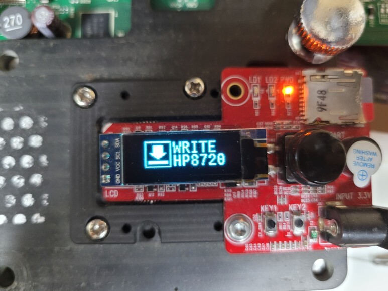 HP 8720 무한잉크 메인보드를 No Chip 펌을 하기 위해 지그에 물리고 전원을 연결했습니다. 메인보드 No Chip 펌 라이팅한 후에 메인보드 재장착 완료했습니다.