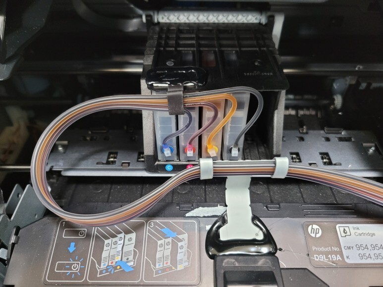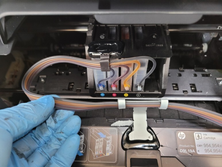 HP 8720 팩스복합기 하우징 타공하여 호스를 밖으로 빼고 석션하여 호스 및 카트리지 내부에 잉크를 가득 채웠습니다.