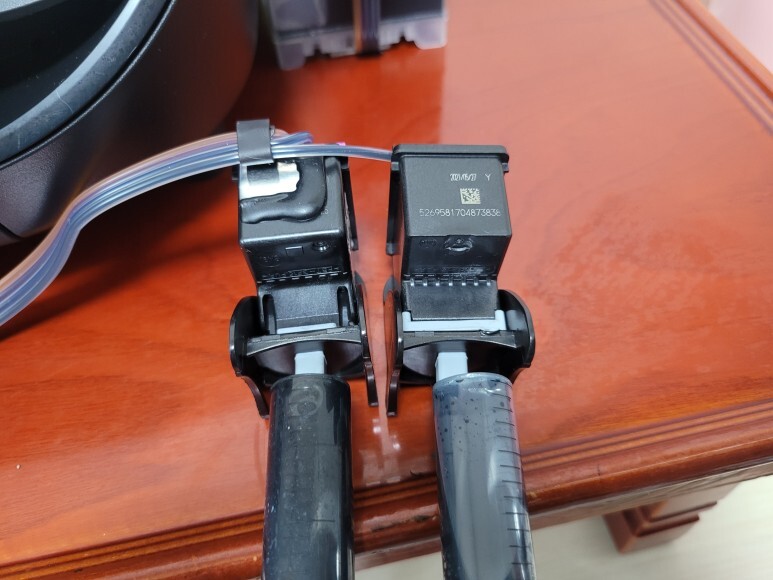 삼성 INK-M180 INK-C180 카트리지에 석션 홀더를 장착하고 석션하여 호스 및 카트리지 내부에 잉크를 가득 채웠습니다.