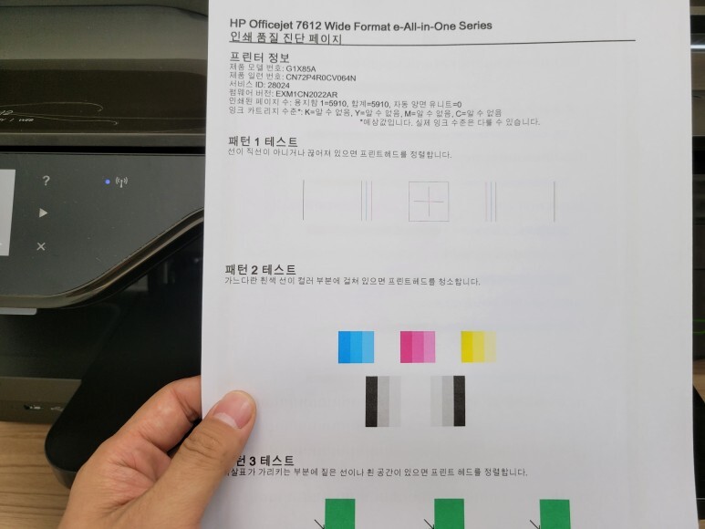 HP 7612 팩스복합기 A3 무한잉크가 정상적으로 헤드 정렬 페이지가 출력되어 나왔습니다.