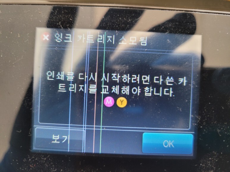 HP 7612 팩스복합기 A3 무한잉크 잉크 카트리지 소모됨 문제로 멈춰 있습니다.