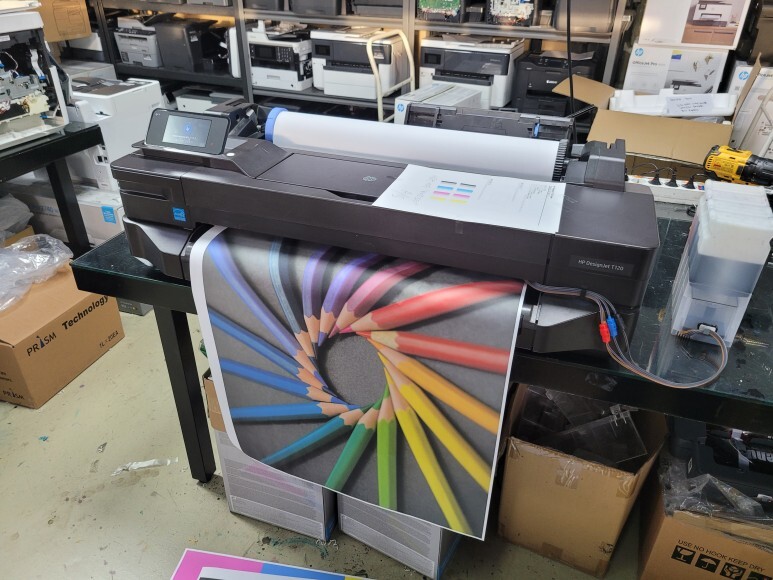 경기도 고양시 덕양구 소재 HP T120 24인치 플로터인데 정품 카트리지를 사용 장비있데 출력불량 및 HP T120 24인치 플로터 무한잉크 장착 완료했습니다.