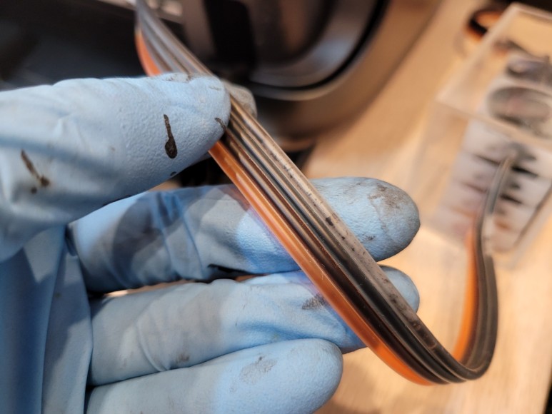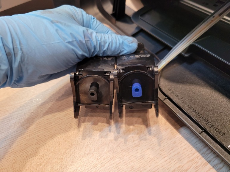 잉크 카트리지에 연결되어 있는 호스, 공급선에 잉크가 모두 빠져 있고, 잉크가 경화되어 굳고 있었습니다