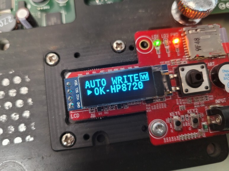 HP 8720 무한잉크 메인보드를 No Chip 펌을 하기 위해 지그에 물리고 전원을 연결했습니다. 메인보드 No Chip 펌 라이팅한 후에 메인보드 재장착 완료했습니다.