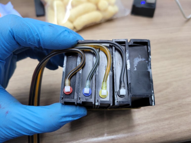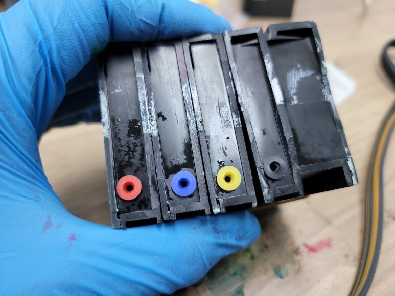 카트리지 잉크 석션하여 호스 및 카트리지 내부에 가득 채우고, 하단대용량 공급기도 핫멜트 보강했습니다.