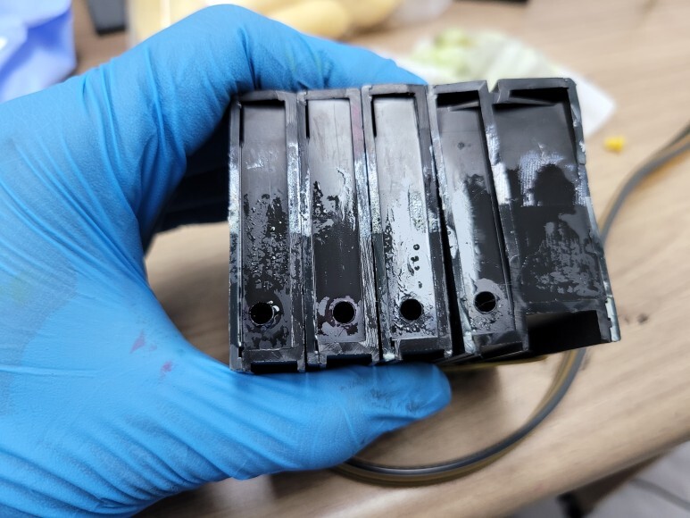 3) 미세한 노즐 막힘은 헤드 챔버 부분을 터지게 합니다. 사람도 뇌혈관이 막히면 터져 사망에 이르게 됩니다. 헤드도 노즐이 막히면 헤드가 터져 잉크가 흐르고 교체해야 하는 비용을 지불하거나 폐기해야 합니다. (중환자실 수술 또는 뇌출혈 사망)