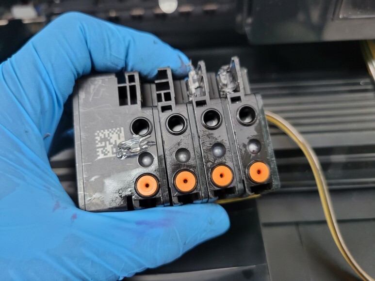HP 8610 무한잉크 헤드에 클램프 부착하고 핫멜트 보강했습니다.