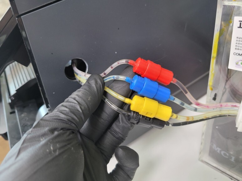 호스를 잘라 퀵차단밸브 장착했습니다. 하우징 타공하여 무한잉크 공급장치를 결합, 심플하게 연결했습니다.