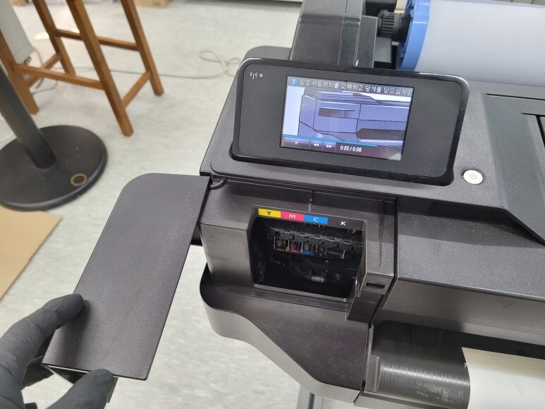 HP T120 24인치 플로터 카트리지 커버를 열고 헤드가 움직이면 상판부 커버를 열어 헤드를 손으로 잡아 움직여 꺼냈습니다.