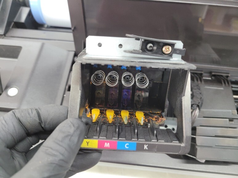 헤드 내부를 보니 노랑색 잉크가 흘러 심하게 오염되어 있었습니다. 헤드 챔버가 터짐 (뇌출혈)