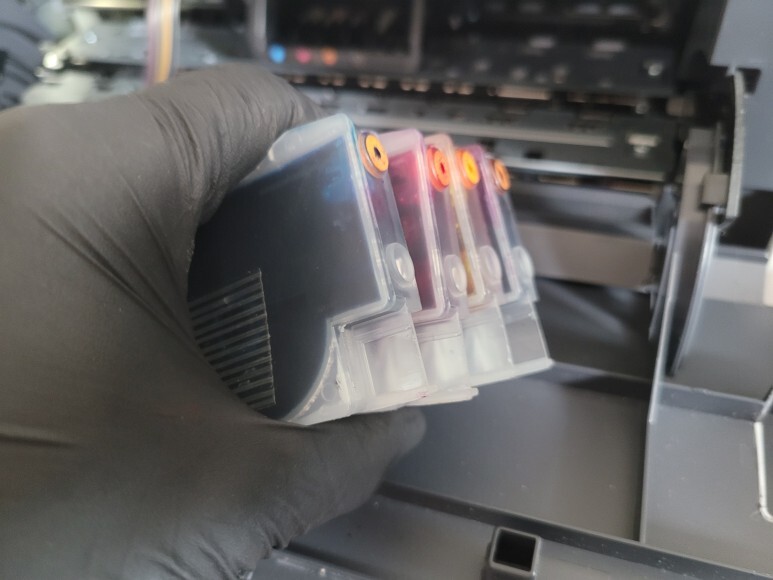 카트리지에 칩이 달려 있어 모두 제거하고, 호스를 잘라 언제든지 쉽게 분리, 이동가능하게 공급장이를 연결했습니다. 타공하여 호스를 밖으로 빼내고 결합, 석션하여 호스 및 카트리지 내부에 잉크를 가득 채웠습니다.