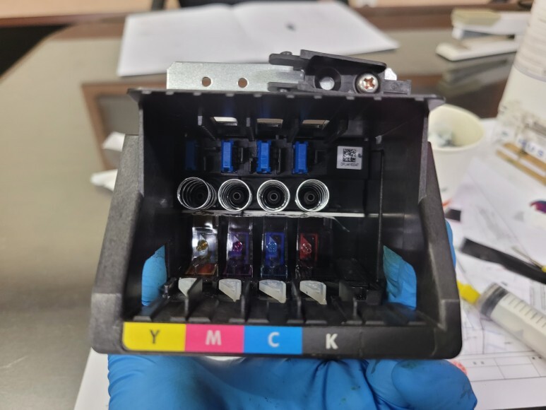 HP T120 24인치 플로터의 헤드를 세척하기 위해 장비에서 꺼냈습니다.