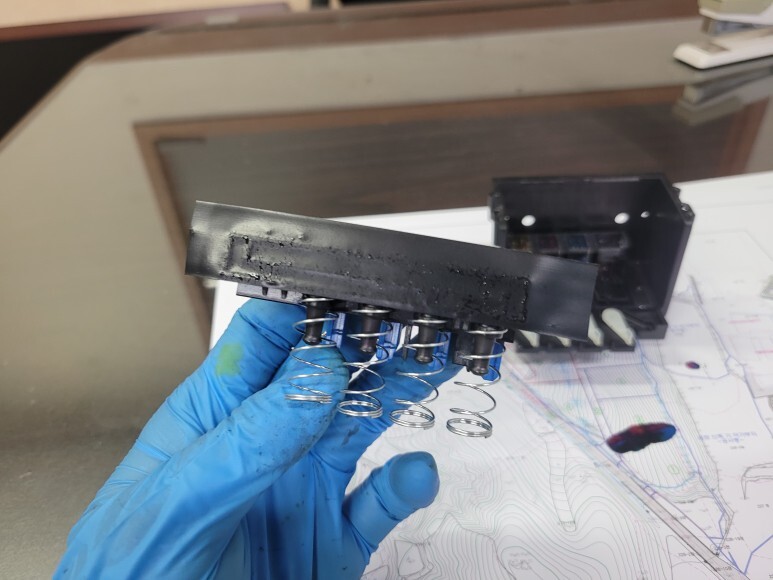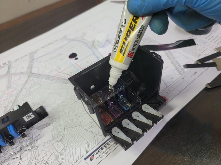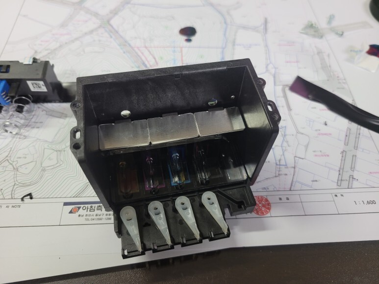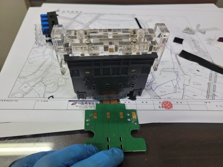 HP T120 24인치 플로터 헤드 챔버에 탄성접착제를 얇게 도포하고 메탈클램프 보강 후 지그로 눌러 양생했습니다.