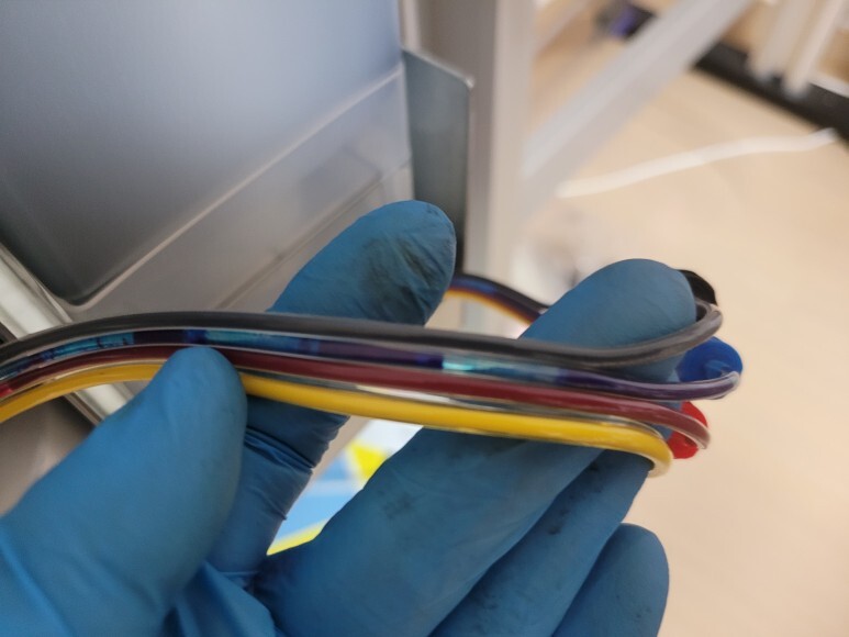 HP T525 24인치 플로터 무한잉크가 Cyan 잉크 카트리지 소모됨 문제로 멈춰 있었습니다. 시안 색상의 호스에 잉크가 빠져 있고 공급되지 않고 있었습니다.