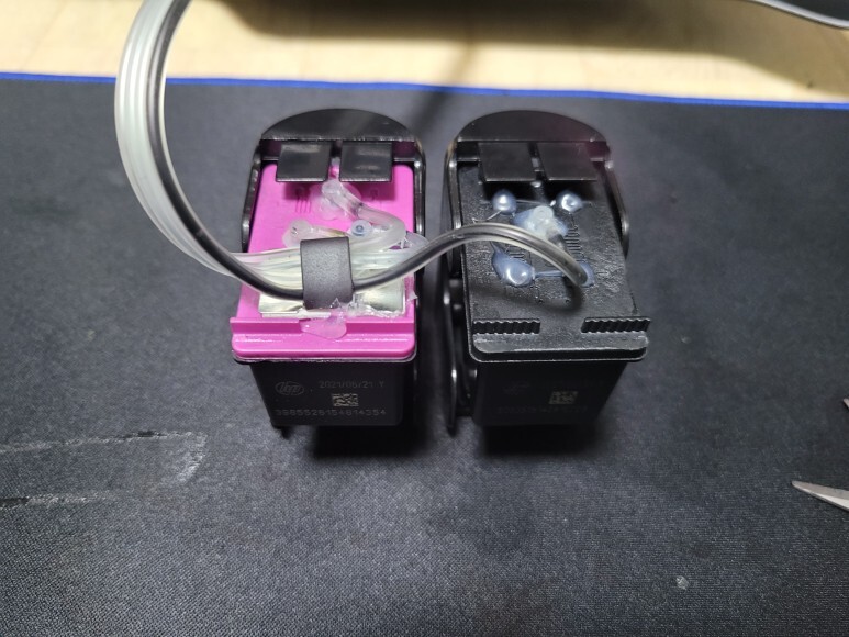HP 오피스젯 3833 팩스복합기 하우징 타공하여 공급선을 밖으로 빼고 잉크 퀵차단밸브를 장착하여 외부 잉크 공급기와 결합, 연결했습니다.