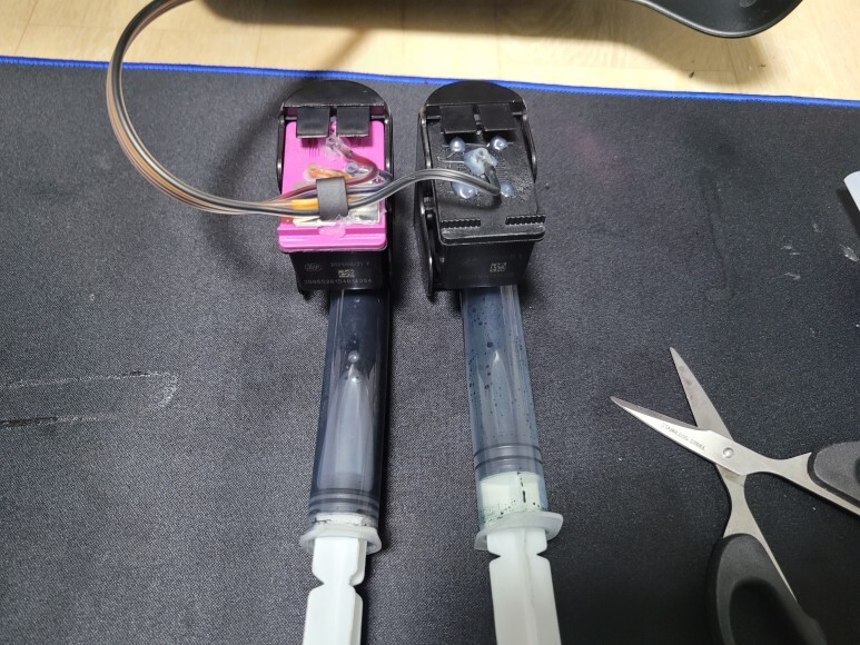 카트리지 잉크 석션하여 호스 및 카트리지 내부에 잉크를 가득 채웠습니다.
