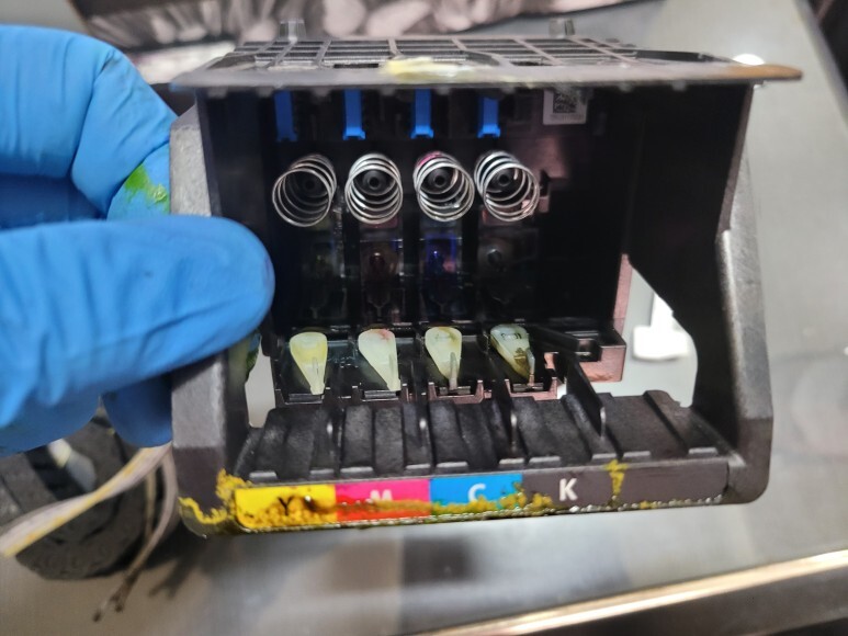 HP T120 대형프린터 무한잉크 카트리지 와 헤드에 심하게 오염되어 있었습니다.