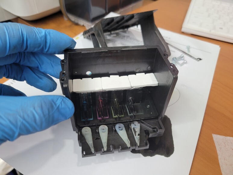 HP 7740 무한잉 카트리지에 칩이 달려 있어 모두 제거하고, 호스를 잘라 언제든지 쉽게 분리, 이동가능하게 공급장이를 연결했습니다. 타공하여 호스를 밖으로 빼내고 결합, 석션하여 호스 및 카트리지 내부에 잉크를 가득 채웠습니다.