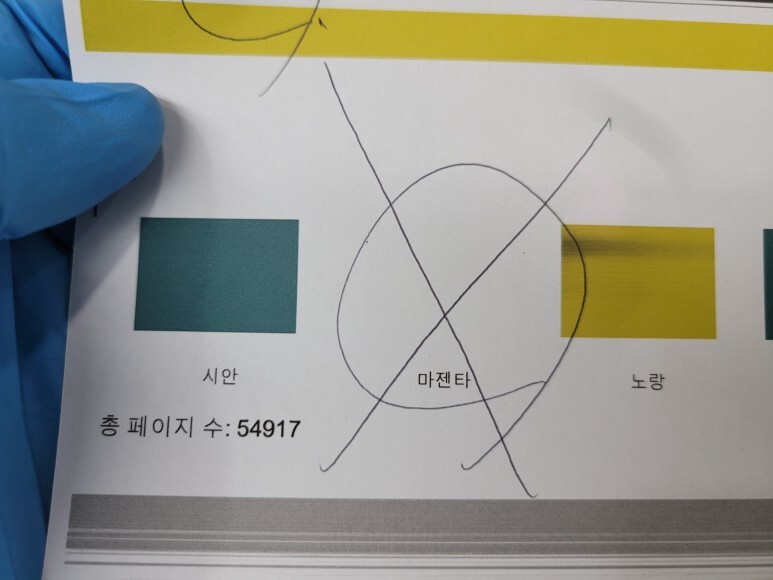 인쇄 품질 진단 페이지를 출력하여 헤드 노즐 상태를 점검하였습니다.