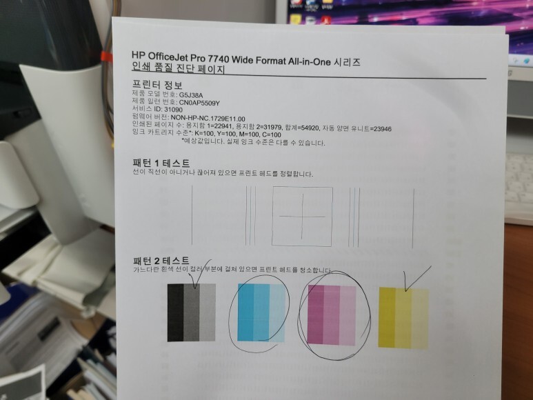 HP 7740 무한잉크, 인쇄 품질 진단 페이지를 출력하여 헤드 노즐 상태를 점검하였습니다. 마젠타 색상이 전혀 출력되지 않았습니다.
