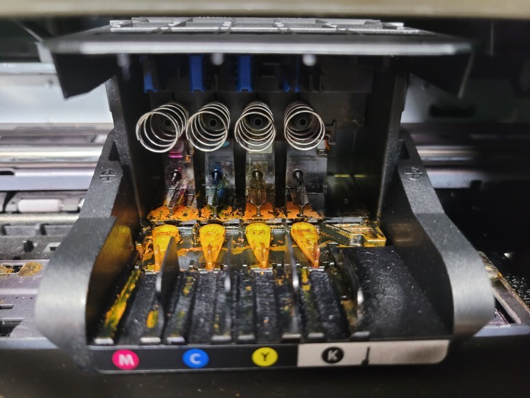 HP OfficeJet 7612 무한잉크 A3 팩스복합기의 카트리지를 빼서 헤드 내부를 보니 헤드 챔버가 터져 심하게 오염되어 있고 스타휠 구간에 잉크가 누수되어 오염되어 있었습니다. 뇌출혈 및 뇌출혈로 혈흔이 남아 있다고 생각하면 됩니다. 너무 아파서 정신이 잃고, 시스템에러를 일으킨 상태입니다.