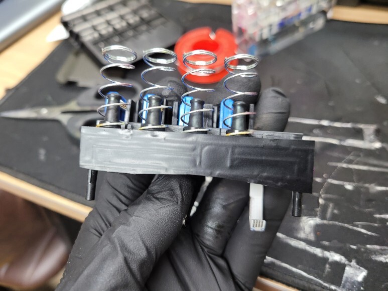 헤드 챔버 터짐을 탄성접착제 도포 및 테이핑 보강하고 지그로 눌러 양생했습니다.