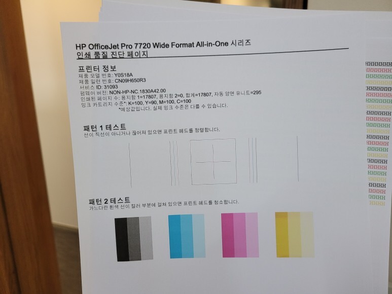 인쇄 품질 진단 페이지를 출력하여 헤드 노즐 상태를 점검하였습니다.