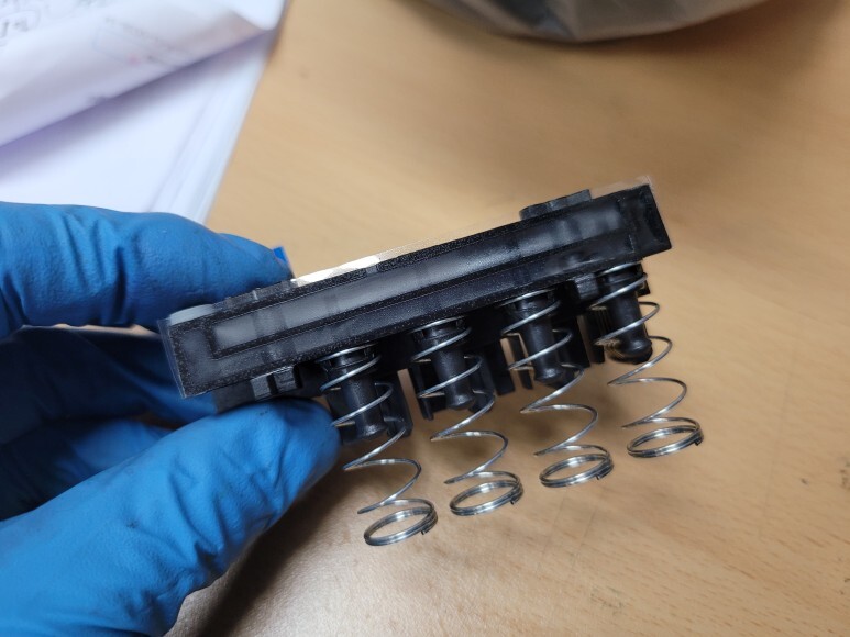 석션 패킹부싱 공기유입점검으로 카트리지 및 호스 내부에 잉크를 가득 채운 후에 헤드 를 분해하여 슈팅에어라인 비닐 탈락 점검하였습니다. 헤드 챔버 터짐 및 PCB 오염 등등 점검하였습니다.
