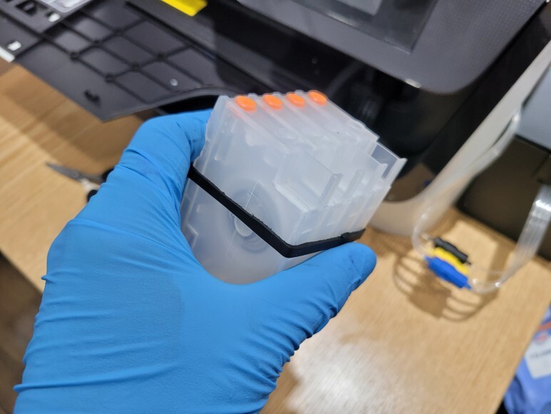 호스를 잘라 잉크 퀵차단밸브를 장착하여 호스 내부의 경화된 잉크를 세척, 하우징을 타공하여 호스를 밖으로 배출했습니다. 삼성 SL-J3560FW 카트리지 석션하여 호스 및 카트리지 내부에 잉크를 가득 채우고, 크램프를 헤드를 부착하고 핫멜트 보강, 헤드에 장착하여 호스를 단단히 잡아주고 말끔하게 정리하였습니다.