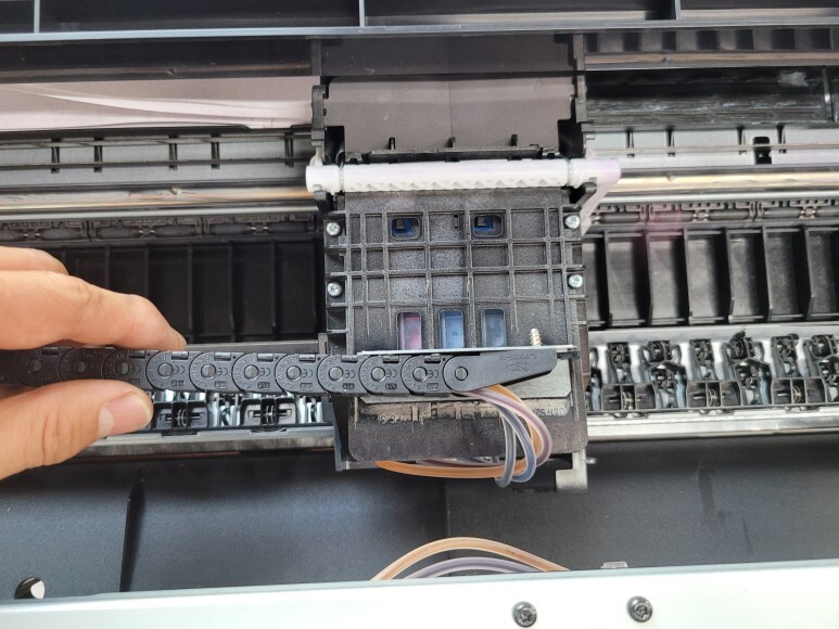 인증칩 부착 및 카트리지를 헤드에 장착, 브라켓 부착 및 체인 결합 완료했습니다.