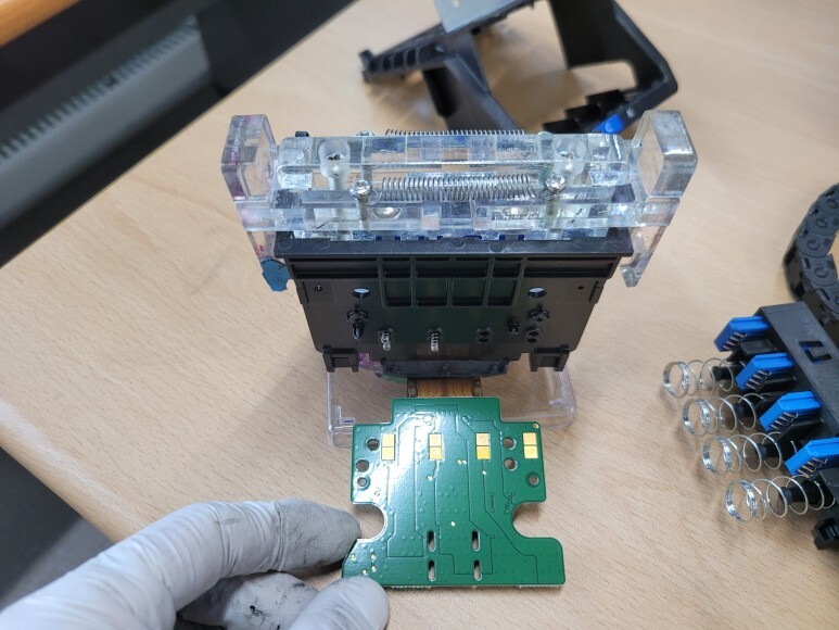 헤드를 분해해 보니 심하게 내부 잉크 오염으로 크리닝 및 챔버 탄성접착제 도포 및 테이핑, PCB 크리닝 했습니다.