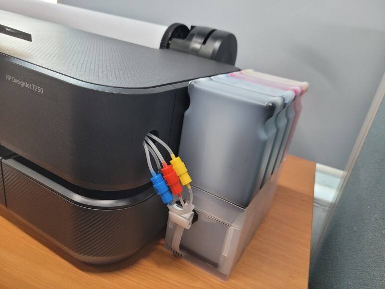 경기도 화성시 동탄 소재 건축설계관련 사무실에서 사용하는 HP 디자인젯 T200 시리즈(HP T230, HP T250) 24인치 플로터 - HP 디자인젯 T250 플로터인데 정품 카트리지 사용중 잉크가 고갈되고 헤드 출력상태가 좋지 않아 출장 수리 및 무한잉크 장착 요청으로 스케줄 잡아 이동, 수리 및 무한잉크 장착 완료했습니다.