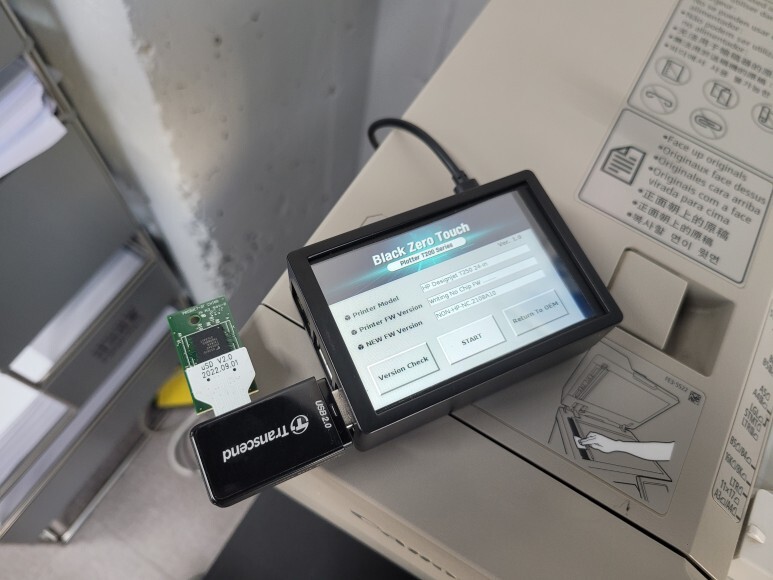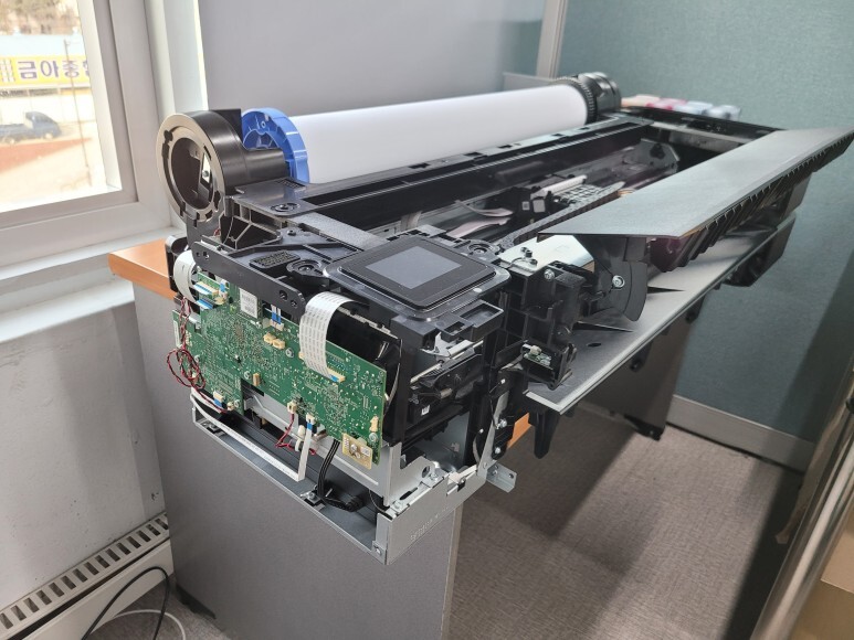 HP 디자인젯 T250 플로터에 무한잉크 장착 및 칩없이 구동되는 플로터로 펌웨어 라이팅 완료 후 전원 켜고 정상적으로 헤드 정렬 완료했습니다.