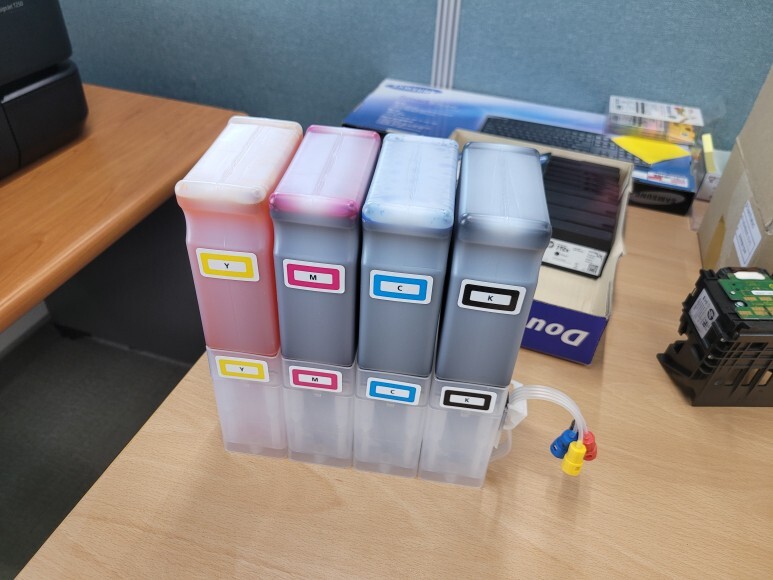색당 500ml 잉크통 총 2,000ml 무한잉크 장치 및 체인, 브라켓, 칩없이 구동하는 카트리지 석션하여 잉크를 가득 채웠습니다.