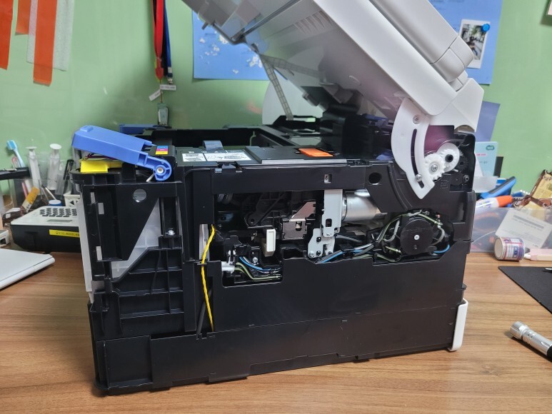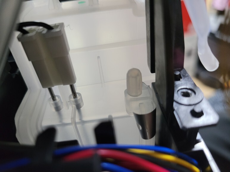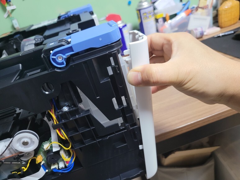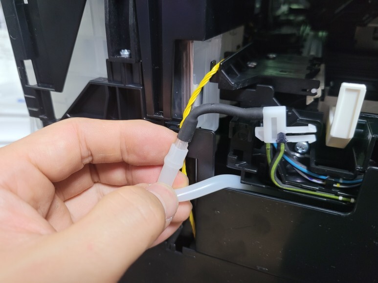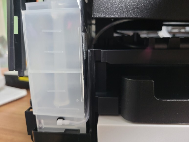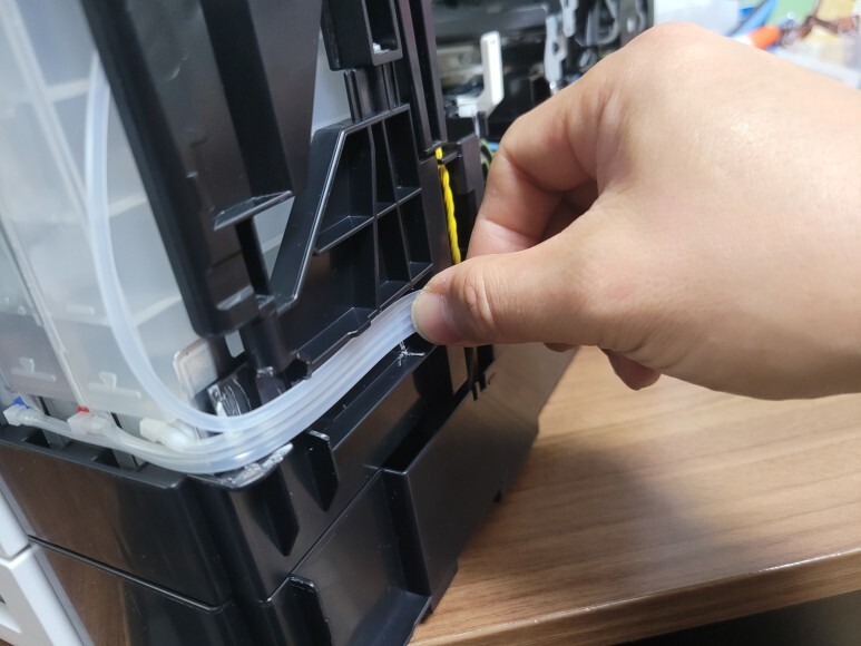 앞쪽 잉크통에 연결된 호스는 내부 플라스틱 프레임을 커팅하여 호스를 정리했습니다.