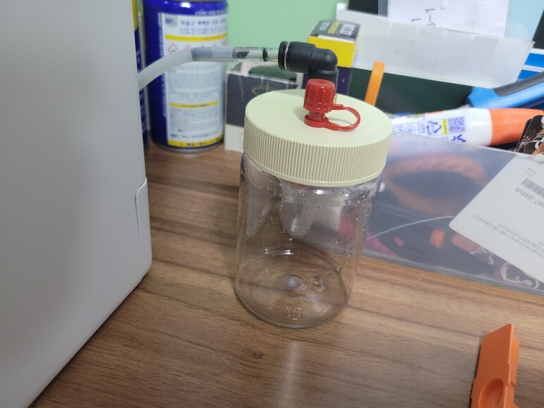 칼라 잉크통 아래에 격벽으로 나뉜 부분이 있는데 격벽 오른쪽 부분에 타공하여 고무 패킹을 삽인한 후 순서대로 호스(공급선)을 재단하여ㄱ자 피팅을 달아 연결했습니다. 칼라 잉크통에 호스를 모두 연결하면 맨 위 BK 블랙 호스가 55~60cm 넉넉하게 남아야 합니다.