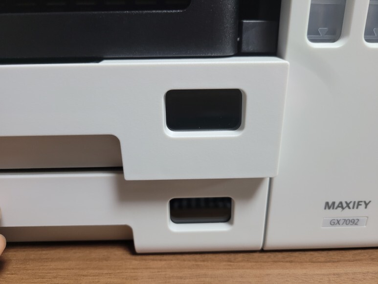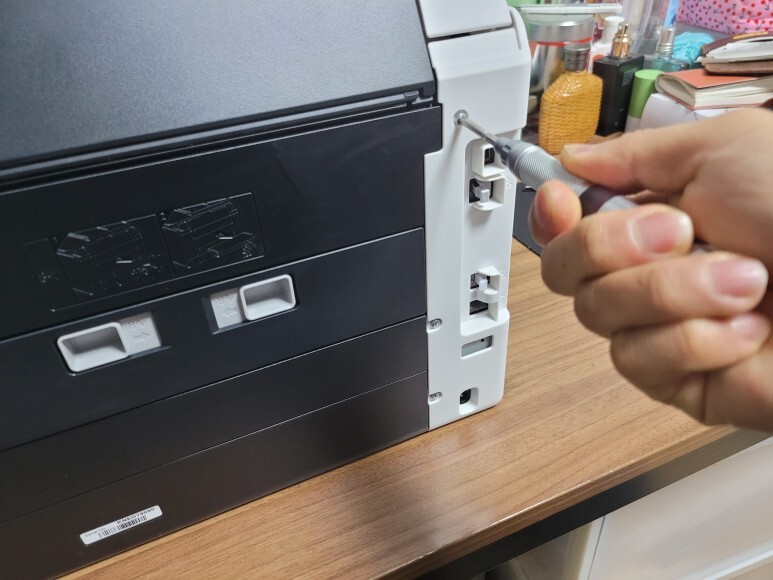 벗겨낸 앞쪽 잉크통 하우징 커버 및 좌우 하우징 커버를 다시 닫고, 오른쪽 하우징을 스텝드릴로 타공하여 예쁘게 잉크 공급선(호스)을 빼내고, 후면도 타공하여 폐잉크통 호스를 빼내서 폐잉크통을 예쁘게 장착했습니다.