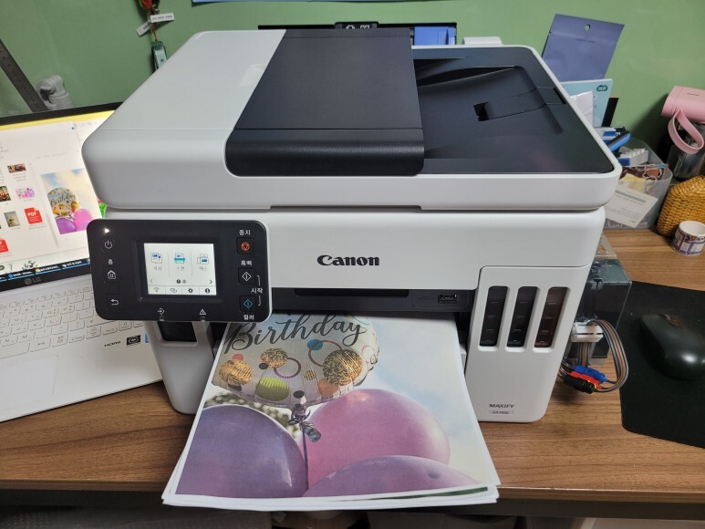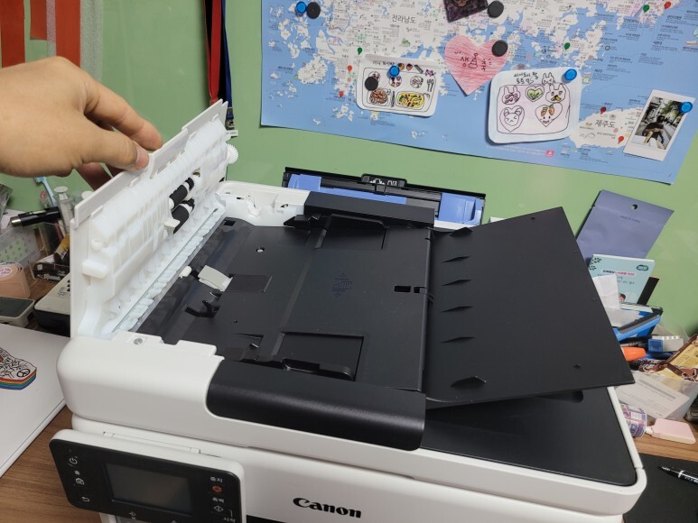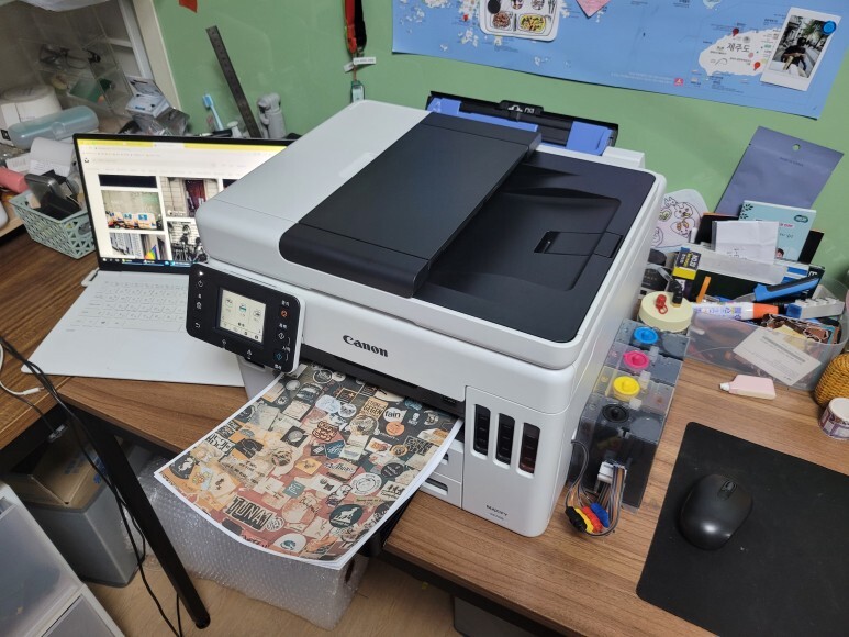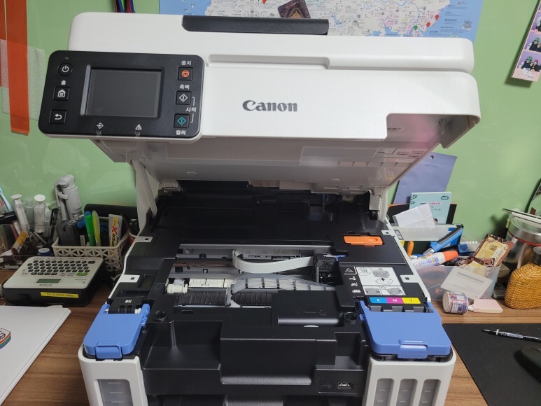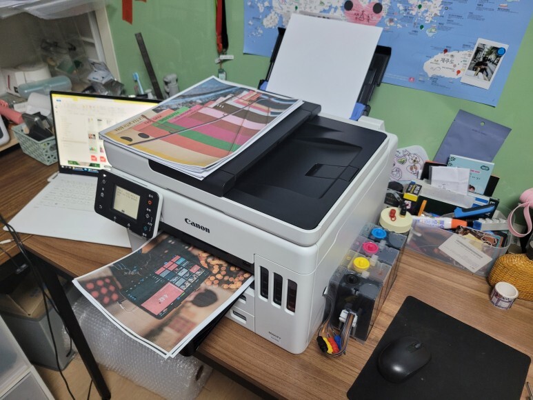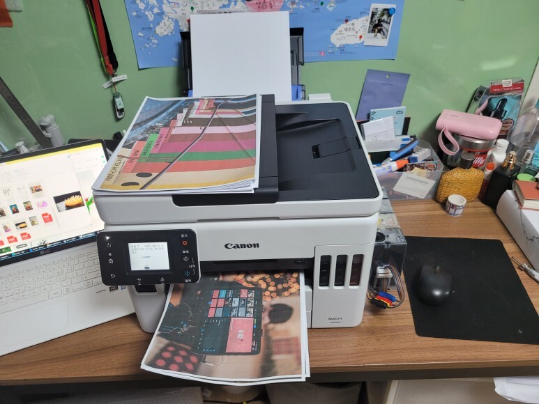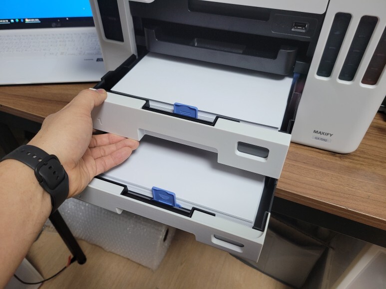 1번, 2번 용지함 모두 용지를 가득 채우고, 전원을 켜서 초기화 진행 후 자동정렬 마감, 노즐 점검페이지 출력 확인했습니다. 속도 좋고, 품질 좋고... 노즐 점검 후에 여러번 풀칼라 출력 테스트 했습니다.
