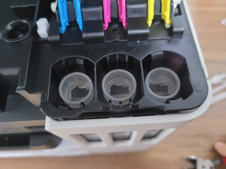 조립이 완료된 후에 마지막 단계인 잉크통 마개를 개방한 후에 내부 주입구 심을 칼라 및 블랙 쪽 모두 리퍼 또는 롱노우즈 펜치로 잡아 빼서 제거했습니다. 시원하게 뻥 뚫리니 좋았습니다. 잉크를 콸콸콸 부을 준비가 되었습니다. 90% 이상 완성입니다.